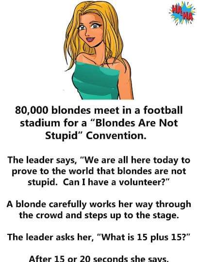 At a large football stadium, 80,000 blondes gather for a “Blondes Are Not Stupid” convention. The goal? To prove once and for all that blondes are far from being unintelligent. The leader takes the stage and calls for a volunteer to demonstrate their collective intelligence.